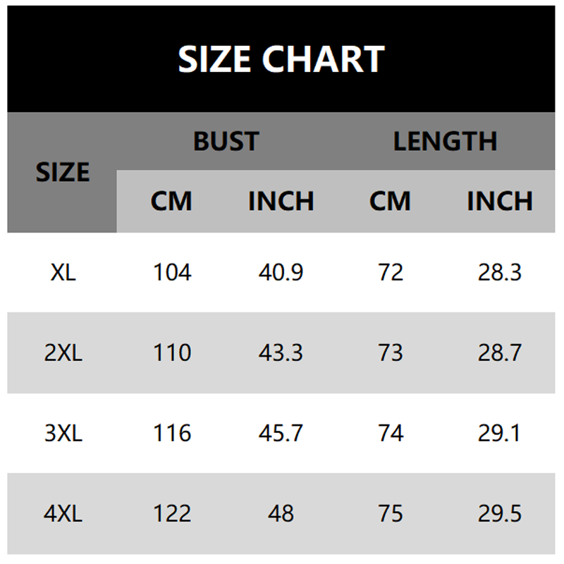| Size | Chest (cm) | Chest (inches) | Length (cm) | Length (inches) |